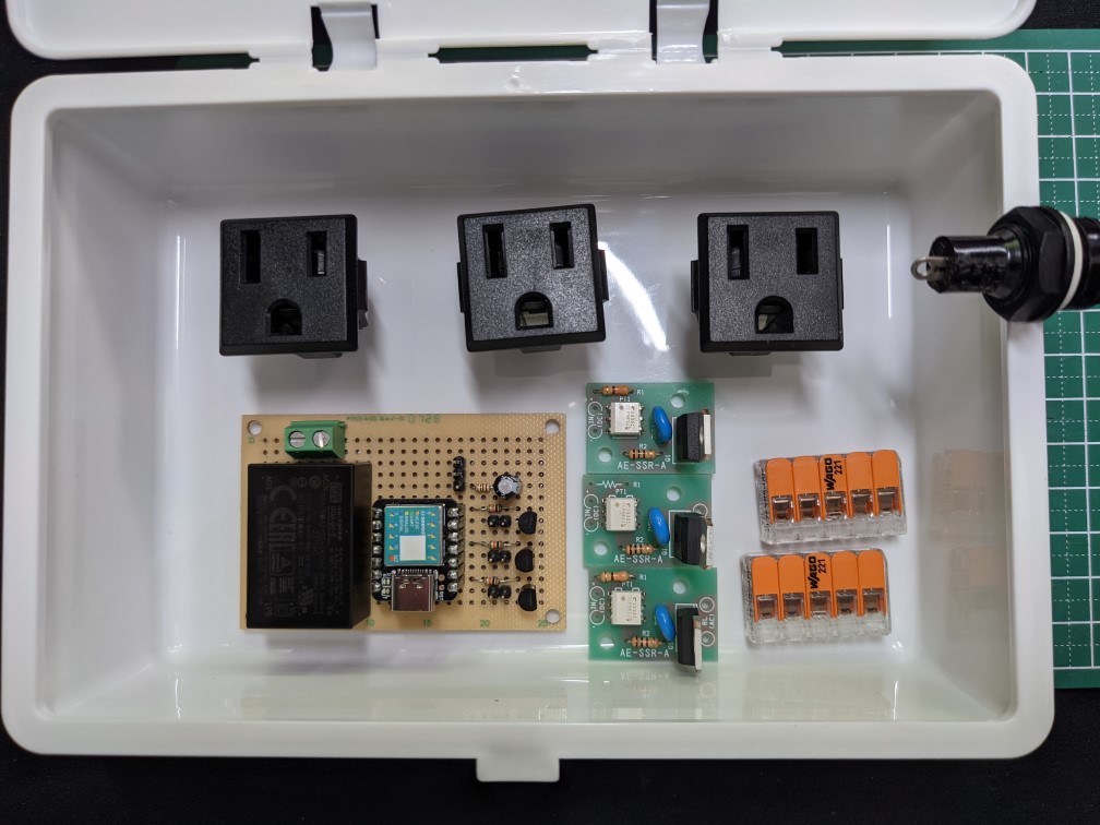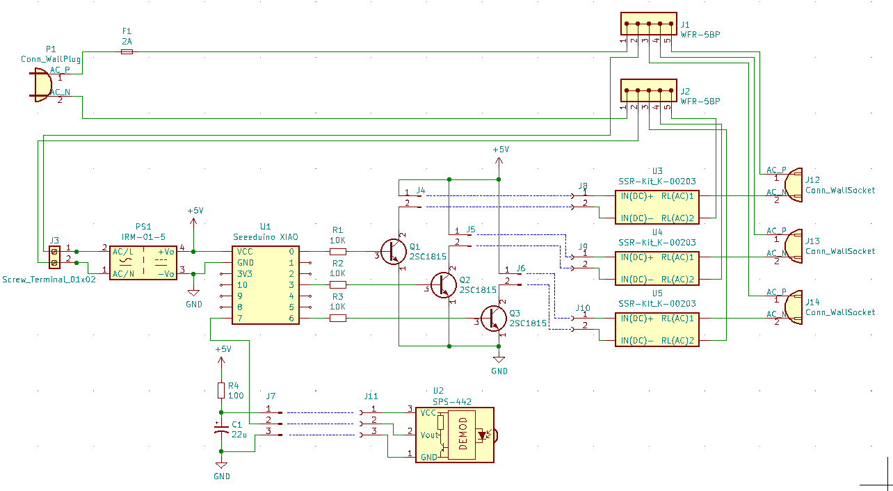 赤外線リモコンのコード受信とSSRキットの制御にはSeeeduino XIAOを使います。たかだか入力1本、出力3本の計4本のIOで済むので、フットプリントの小ささでXIAOを選びました。