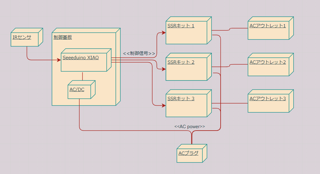 リモコンのコードを受け取ったらXIAOがSSRをON/OFFする、という仕組みです。