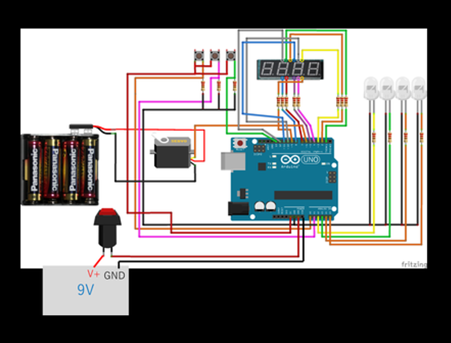 前作1号機では,バッテリーをArduinoへ直接差し込み.Arduinoからサーボモータへ電力を給電していましたが,どうもバッテリーの電力不足からか,挙動が安定しませんでした.