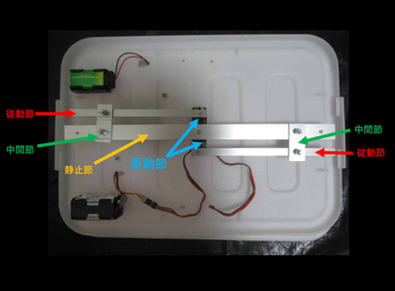 サーボモータが回転すると,図の平板が回転して,「従動節」という平板が,外側の容器に引っ掛かって