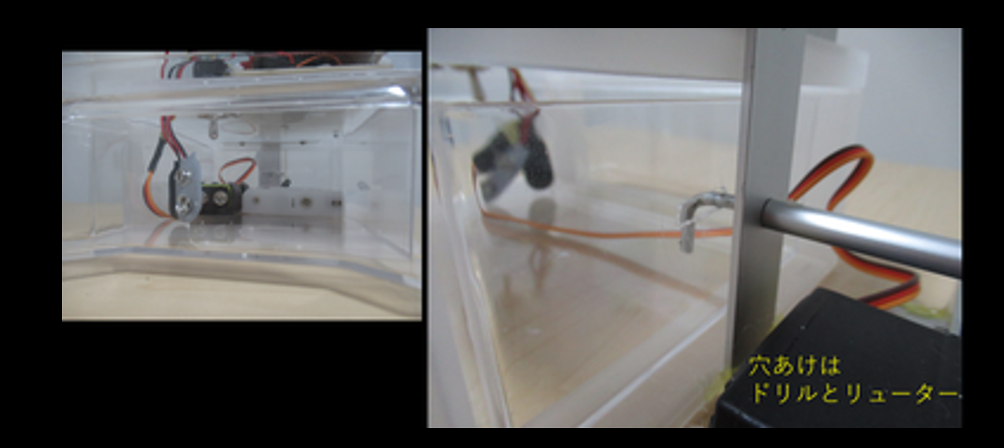 容器側には,中間節用平板が通せるほどの穴をドリルとリューターで開けます.