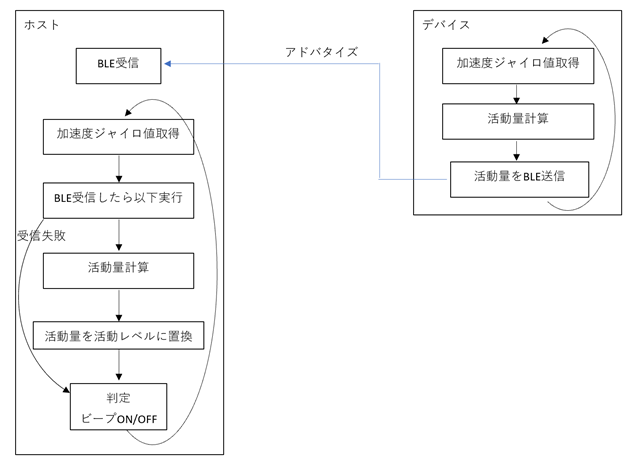 デバイスは活動量を継続的にBLEアドバタイズし、ホストは活動量を受信したら活動レベルの判定を行います。