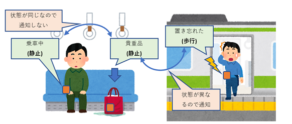 ・ホスト活動レベルが2(歩行)以上で、デバイス活動レベルが0(静止)であれば、置き忘れと判断しビープ音で通知します。