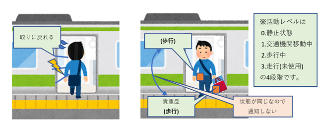 前提として、公共交通機関での置き忘れが発生した直後の状況は、本人は「歩行もしくは走行」し、持ち物は「静止」している状況が殆どです。