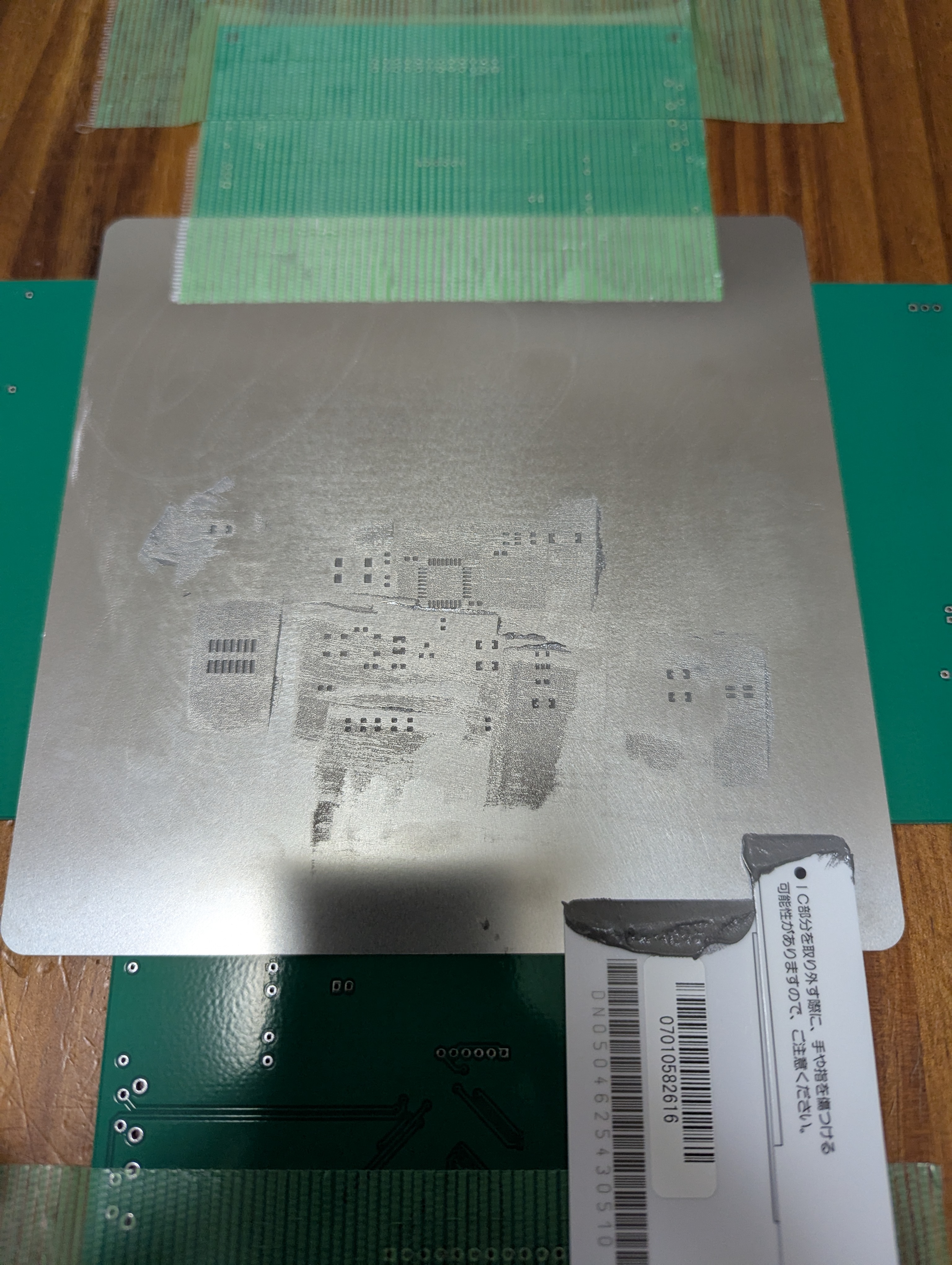 ステンシルもオーダーしたので、クリーム半田を塗布します。その後ホットプレートでリフローを行いました。