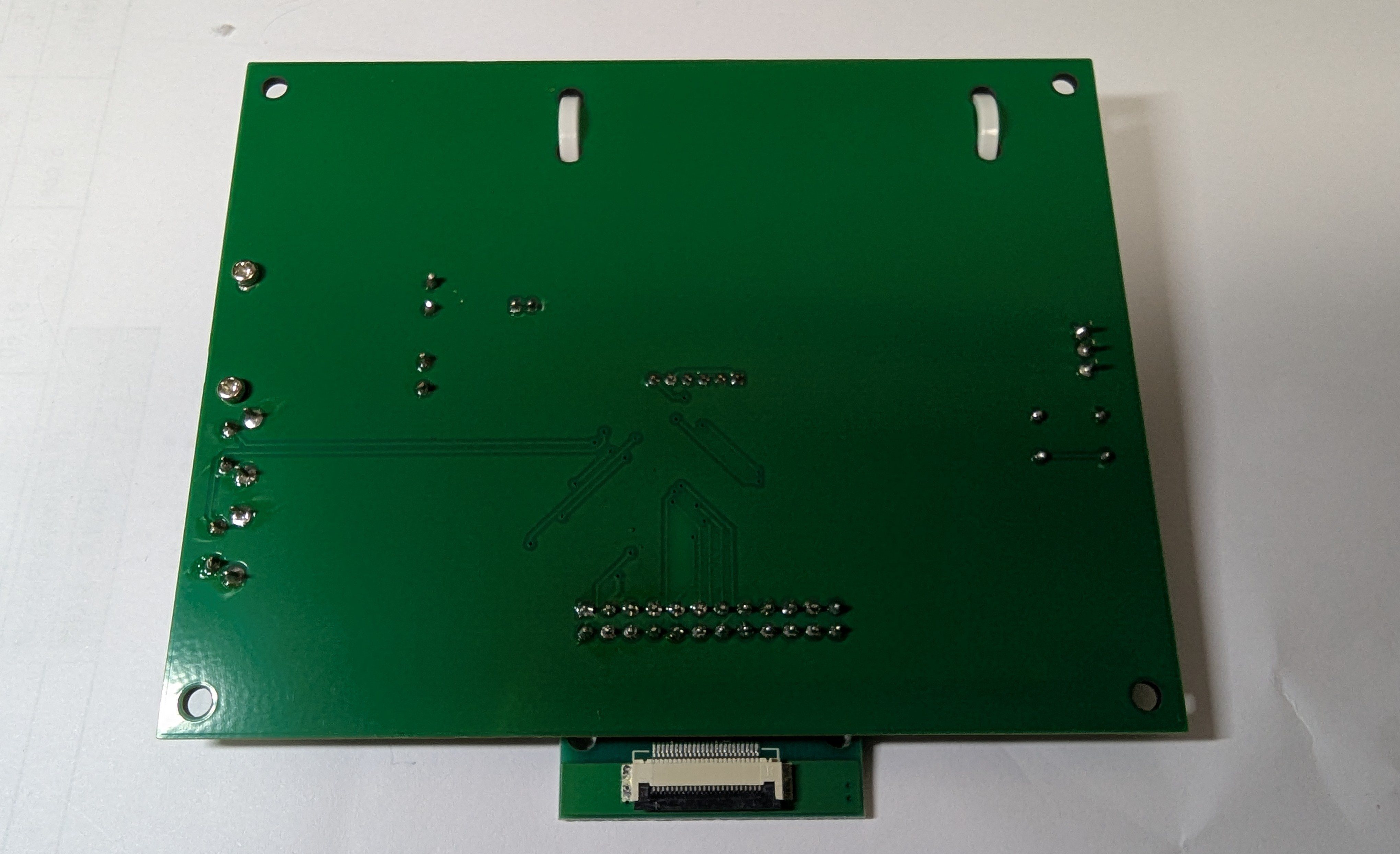 リフロー後の状況です。右上のLIPO充電回路は後付けになったので、ネジで無理くり固定しています。その上の空間にはLIPOバッテリーを配置します。下部のところの追加基板はフラットケーブル用のコネクタを別だしにしています。さすがにアマチュアのはんだ付けではフラットケーブルコネクタは半田付け困難かなと思った為です。