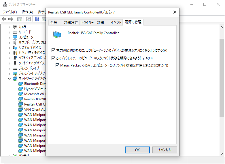 1つ目はデバイスマネージャーの設定です.左下にいつもいるWindowsマークを右クリックするとずらっと文字列がでてきまして,その中のデバイスマネージャーをクリックします.そしてネットワークアダプタの項目を見つけてその中で有線接続してるアダプタのプロパティを開くのです.開いたらプロパティの「電源の管理」タブの中にある「このデバイスで,コンピューターのスタンバイ状態を解除できるようにする」を有効化,そうすると下の「Magic Packetでのみ,コンピューターのスタンバイ状態wを解除できるようにする」が選択できるようになりますので,そちらのチェックボックスにもチェックを入れます.