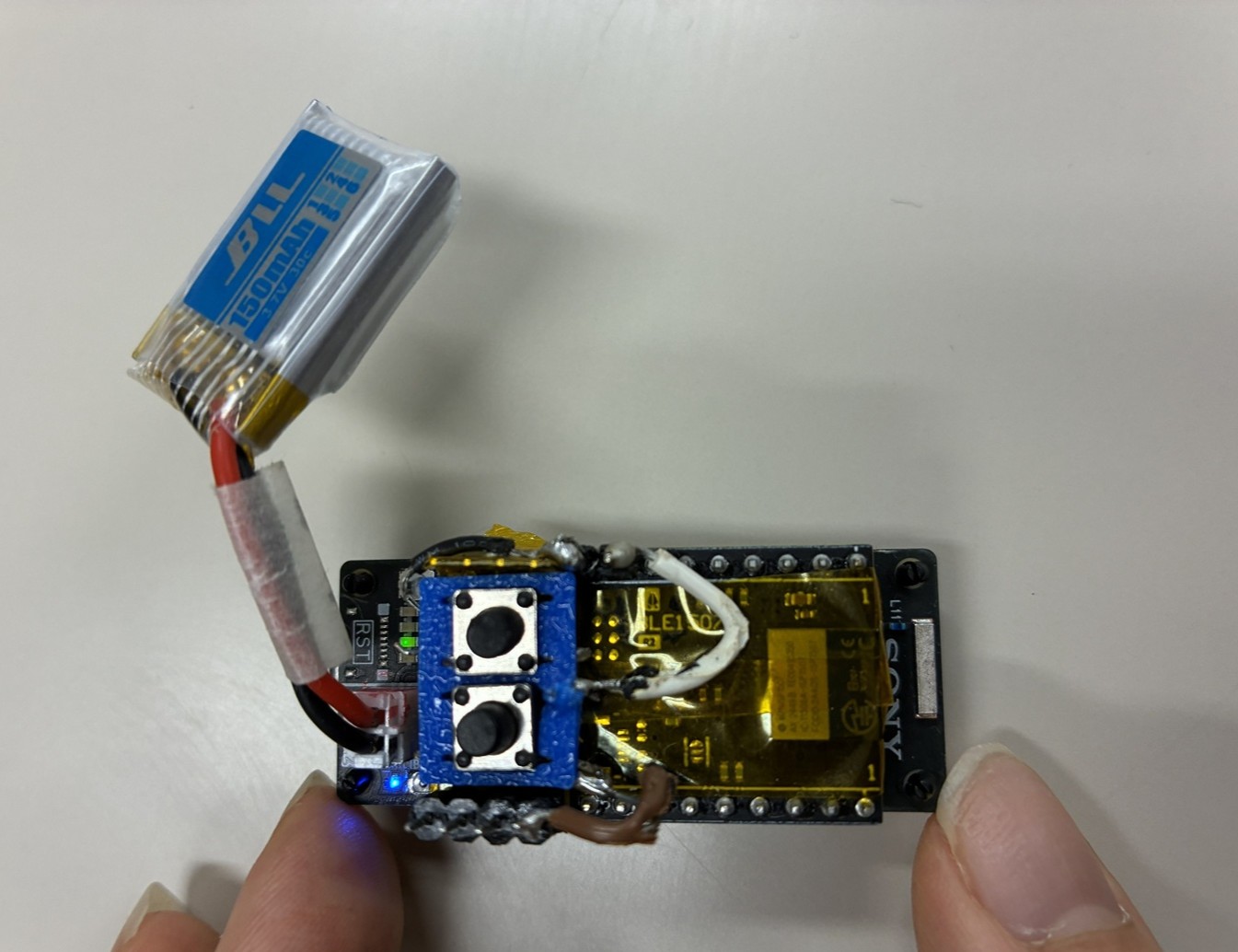 SpresenseにBLE拡張ボードを接続。ピンヘッダを2pinに換装し、タクトスイッチとLipoバッテリーを配線(Lipo バッテリーは必ず+-を確認し,ショートもさせないように気を付けながら使用、電圧落としすぎないように注意)
