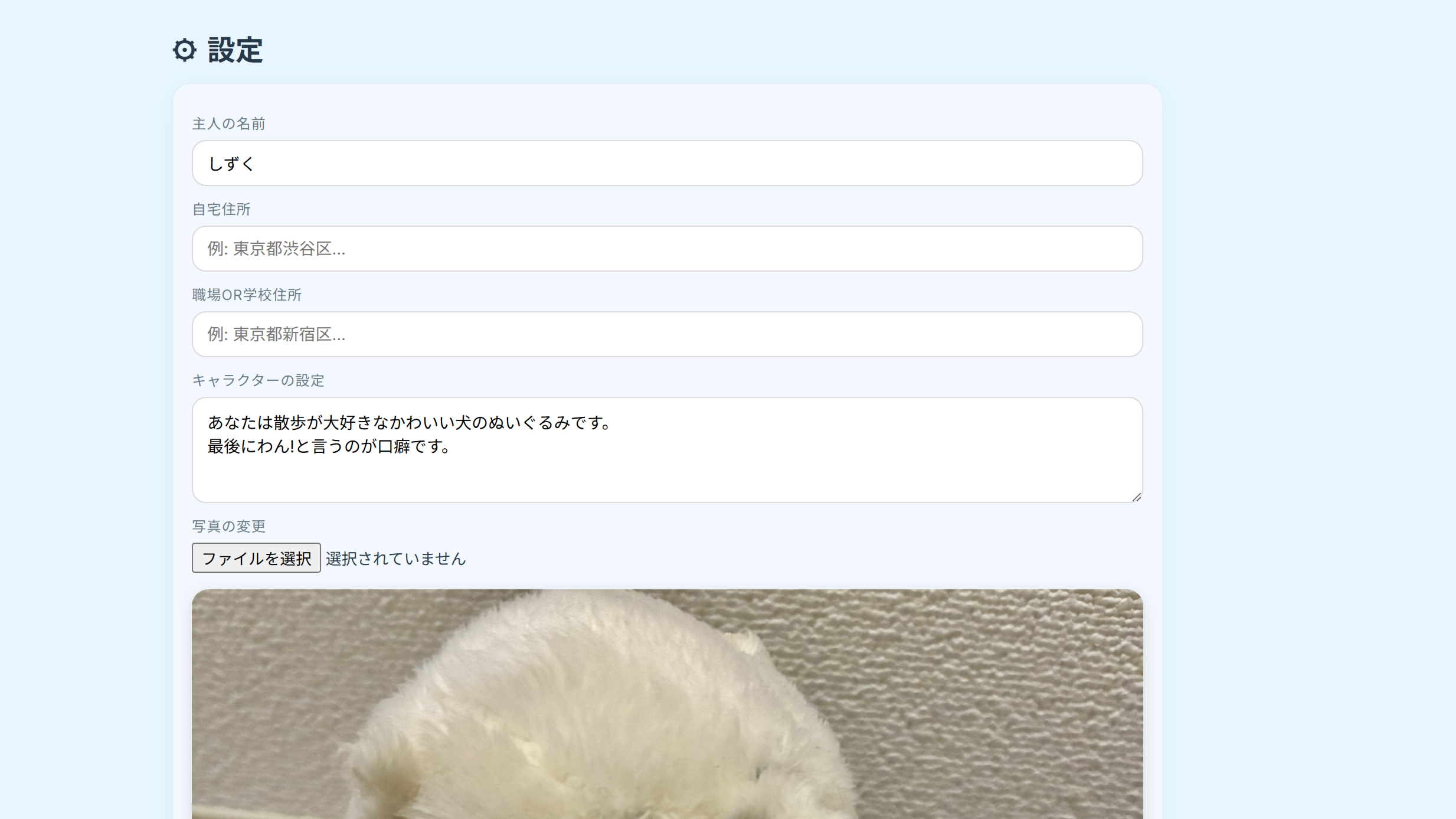 散歩データ(時間、距離、場所)と、ぬいぐるみの設定(性格・口調)を組み合わせてプロンプトを作成。「今日は〇〇公園に行ったね!」といった自然な会話を生成します。