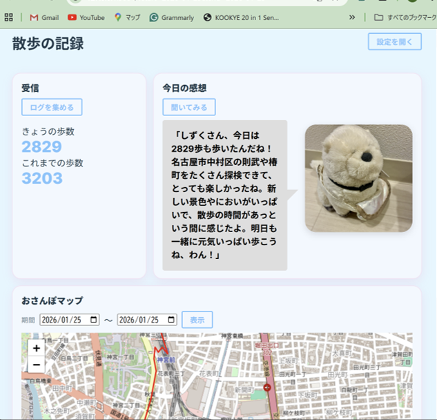 散歩中に位置と歩数を記録し、帰宅後に「楽しかったね!」と感想を話してくれます。ただの記録ではなく、感情を共有するパートナーになります。