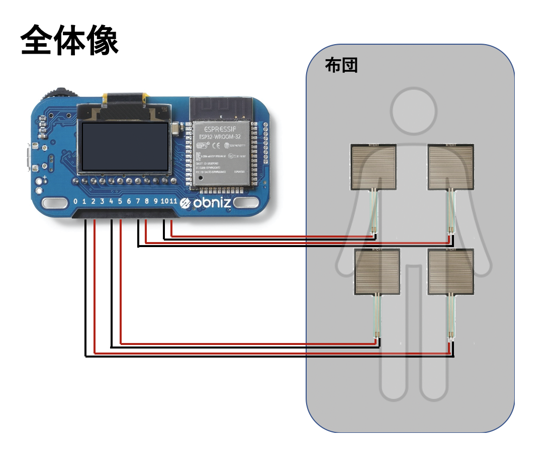 圧力センサを布団の下に配置し、体重負荷によるベット上の体の動きを取得する。obniz Board 1Yにて、データをwebに出力し睡眠モニタリングを行う。