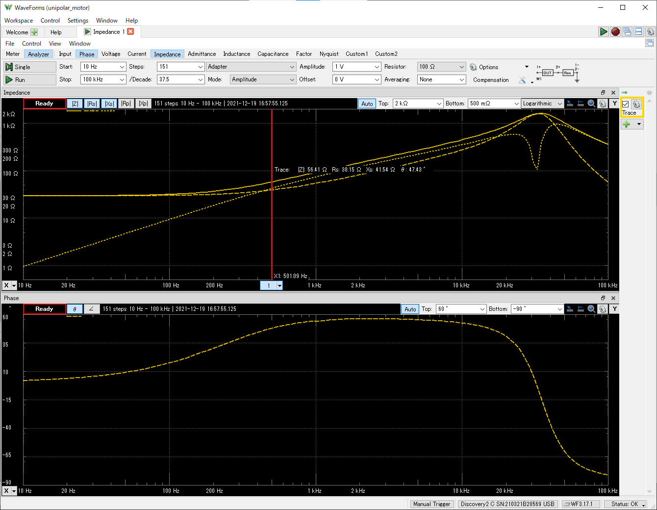 グラフ左端(10Hz)では Rs=30Ω、Xs=1Ω 程度になっています。周波数に比例して Xs が増加していくことが分かります。データシートによるとコイル抵抗は 30Ω ですので、周波数が低い領域における Rs の測定結果はデータシート通りです。