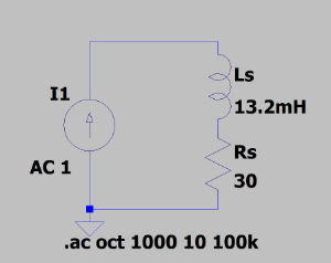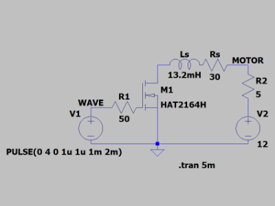 M1 を 500Hz の矩形波でスイッチングさせたときの電流の変化を計る回路です。Ls と Rs がモーターコイルの等価回路です。インピーダンスの計測結果より、直列に 30Ω の抵抗があるとしてモデル化しました。Ls の値(13.2mH)は 500Hz の地点におけるリアクタンス Xs の値から計算しました[2]。