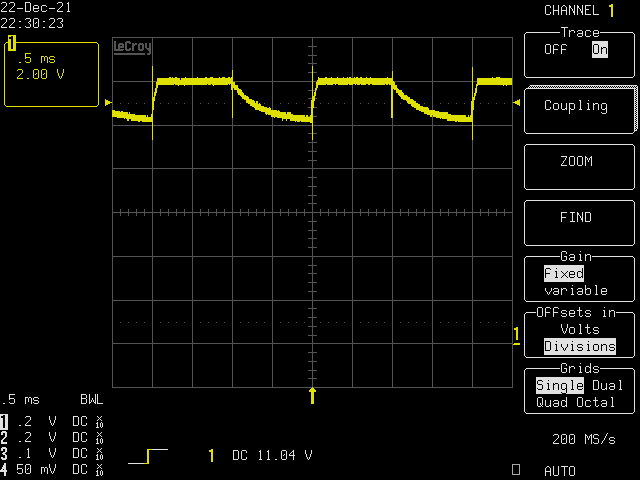 これはモーターの Φ1 - Φ1C 間について V(motor) を計測した結果です。シミュレーションとほとんど同じ形になっていますね。縦軸 1 目盛りが 2V ですので、スイッチオンの瞬間から電圧が下がり始め、最大 1.7V 程度の電圧降下が発生していることが分かります。ということは、その瞬間には 1.7V/5Ω = 0.34A の電流が流れている計算になります。