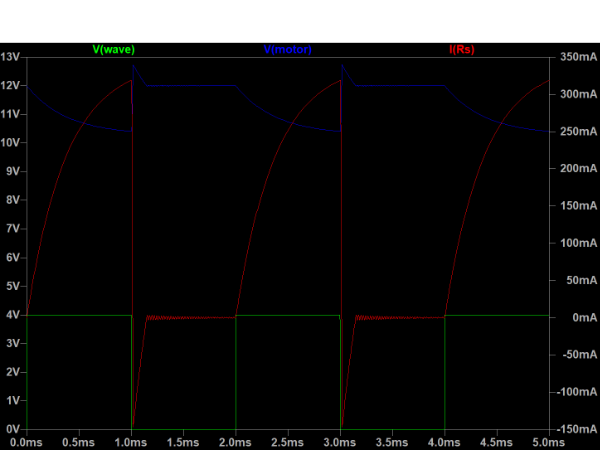 シミュレーション結果を示します。緑のグラフが V(wave)、つまり WAVE 点の電圧です。見ての通り、0V と 4V を繰り返す矩形波です。青のグラフが V(motor) で、MOTOR 点の電圧を示します。後で示す実測結果に表示されているのはここの値です。赤のグラフが I(Rs) で、抵抗 Rs に流れる電流を示します。V(motor) を計測することによって I(Rs) を計算しよう、というのがこの後の実測でやりたいことです。