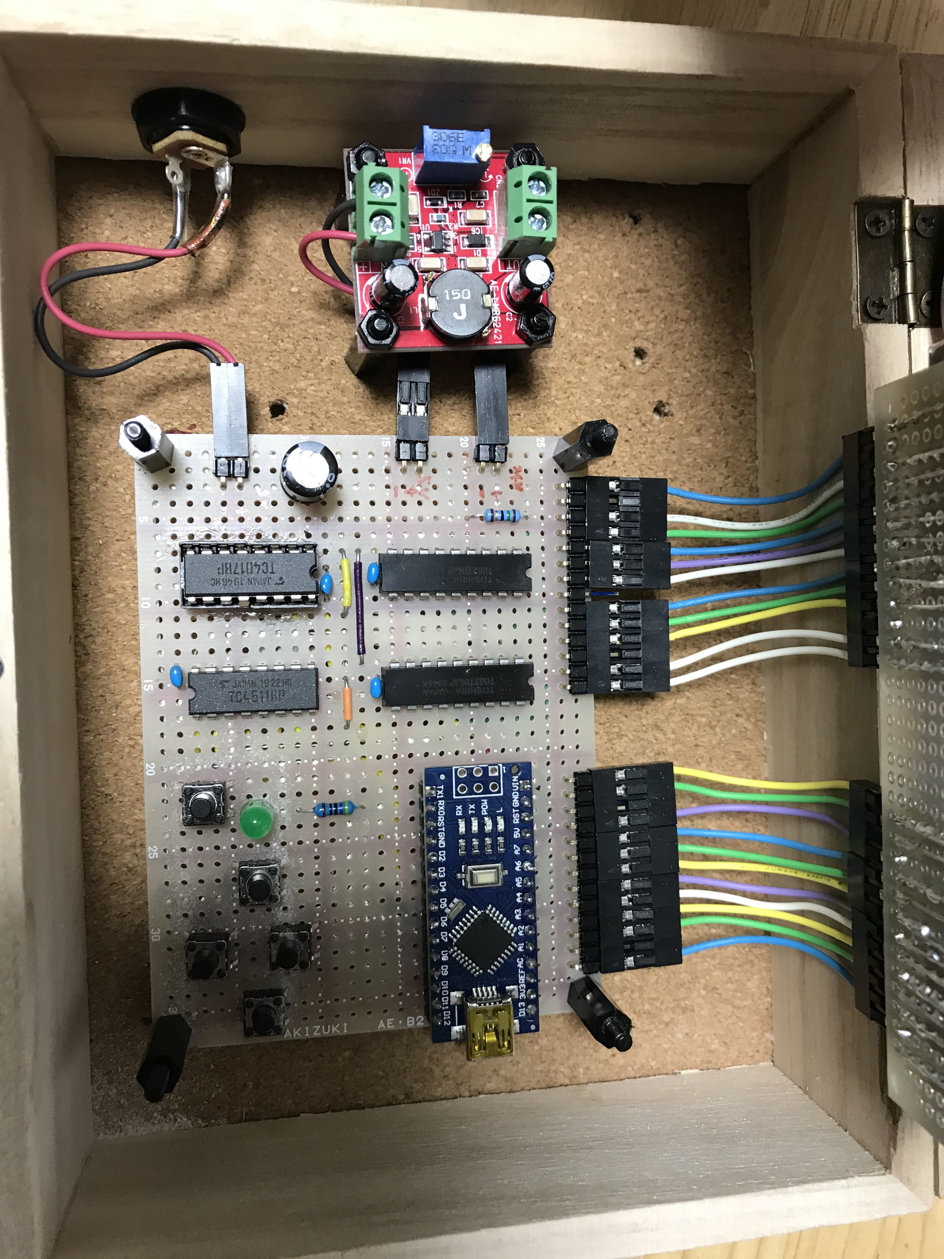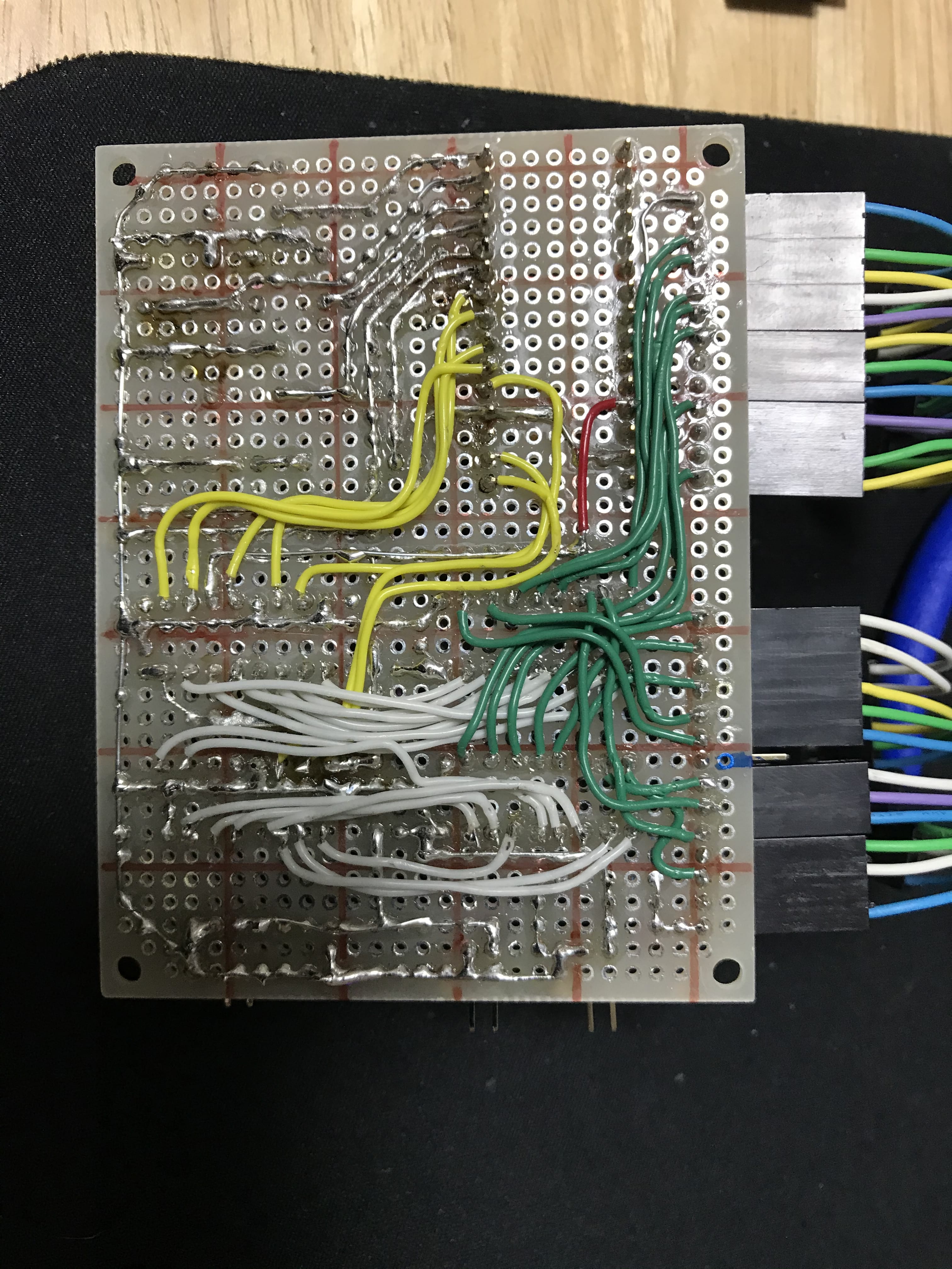 今回はほとんどIOピンとICの線を直結するだけのあまり複雑な回路にはならないため,実体配線図は電源とグランドのみを描き,スズメッキ線で実装し,その他の配線はビニール単線を用いました.しかし配線の数も多いため,あればポリウレタン銅線を用いたほうが実装も楽で配線もすっきりするでしょう.
