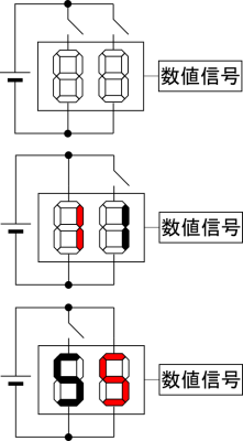 ダイナミック点灯方式とは上図のように複数桁の表示を持つ表示器においてその各桁の表示を同時に行うのではなく,各桁とセグメントの制御を順番に行うことによって1つの数値入力と各桁のスイッチによって複数桁の表示を行う点灯表示方式です.