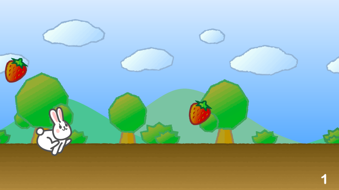 画面はこんな感じで、うさぎが走って風景画スクロール、右からいちごが出てきてうさぎと重なったらゲット。ジャンプもしながら何個取れるかな、というもの。絵も描きました。
