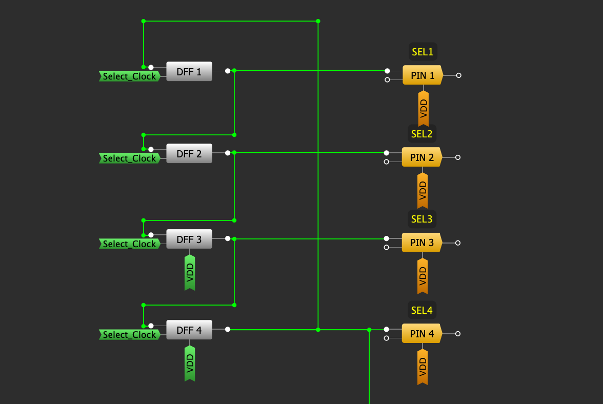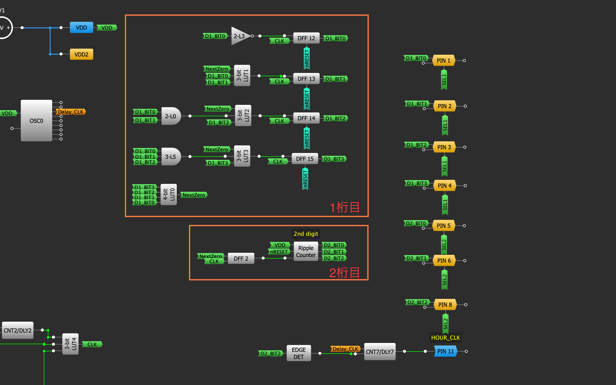 Ripple Counterマクロセルが1要素しかないため、1桁目は同期カウンタ、2桁目はRipple Counterマクロセル(非同期カウンタ)で実装しています。