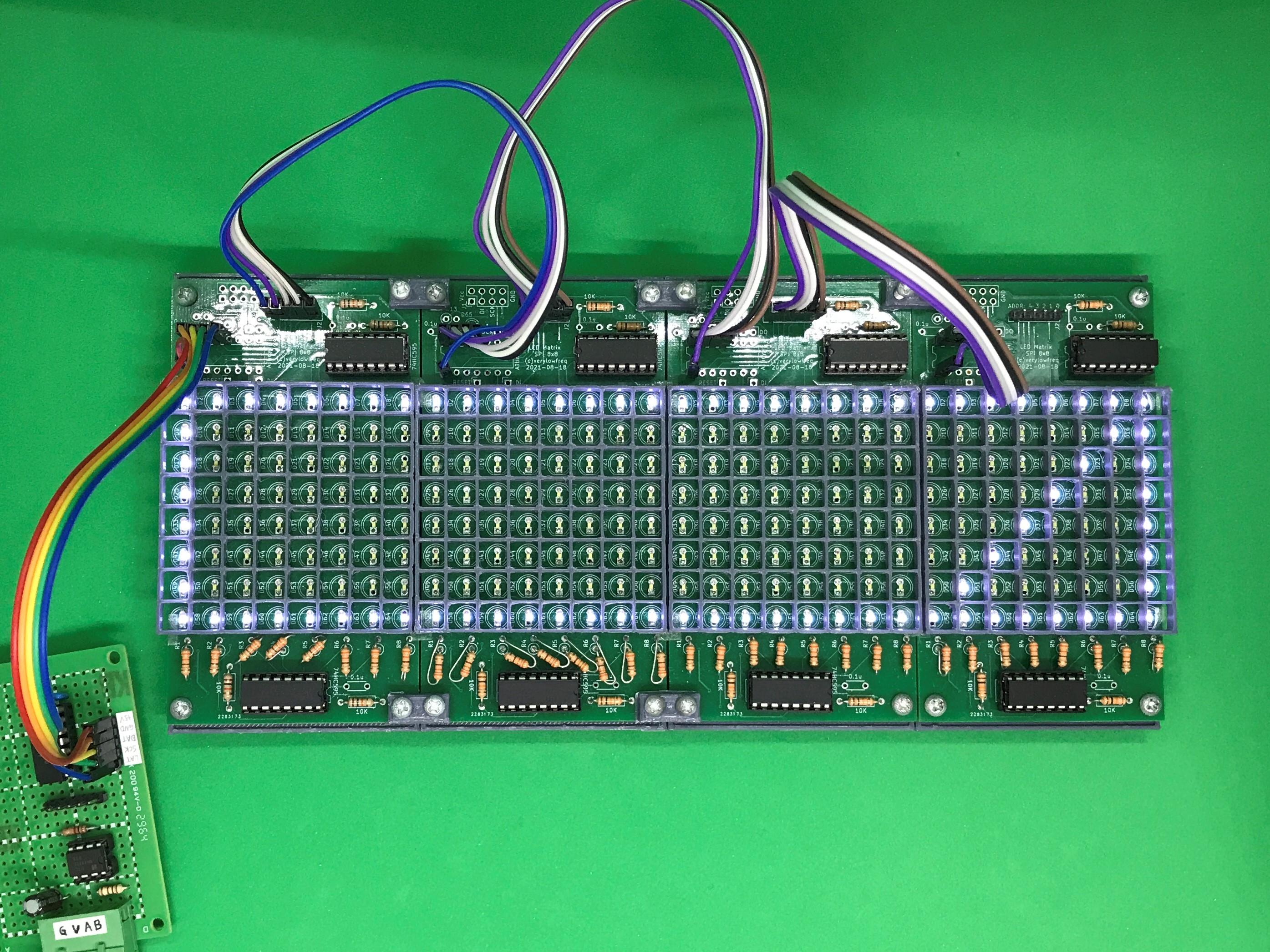 当初の設計では、1枚ごとにATtiny44Aを搭載して、SPI通信でマスターから表示データを受信し、LEDを継続的に制御する構成でしたが、半導体不足によるマイコン入手性の悪化が怖くなり、各基板へのAVR搭載はやめました。個別のLEDは74HC595で行と列を選びつつダイナミック点灯させています。