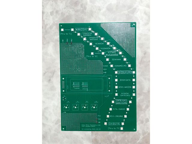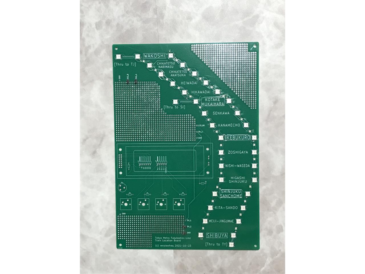 ただの思いつきをうっかり発注してしまったものです。フルカラーLEDをピカピカ光らせて楽しいものということで、東京メトロ副都心線の電車在線状況を表すボードを設計しました。(緩急の追い抜きがある、直通先が数種類ある、路線長が長くない、というのが選定ポイント。)