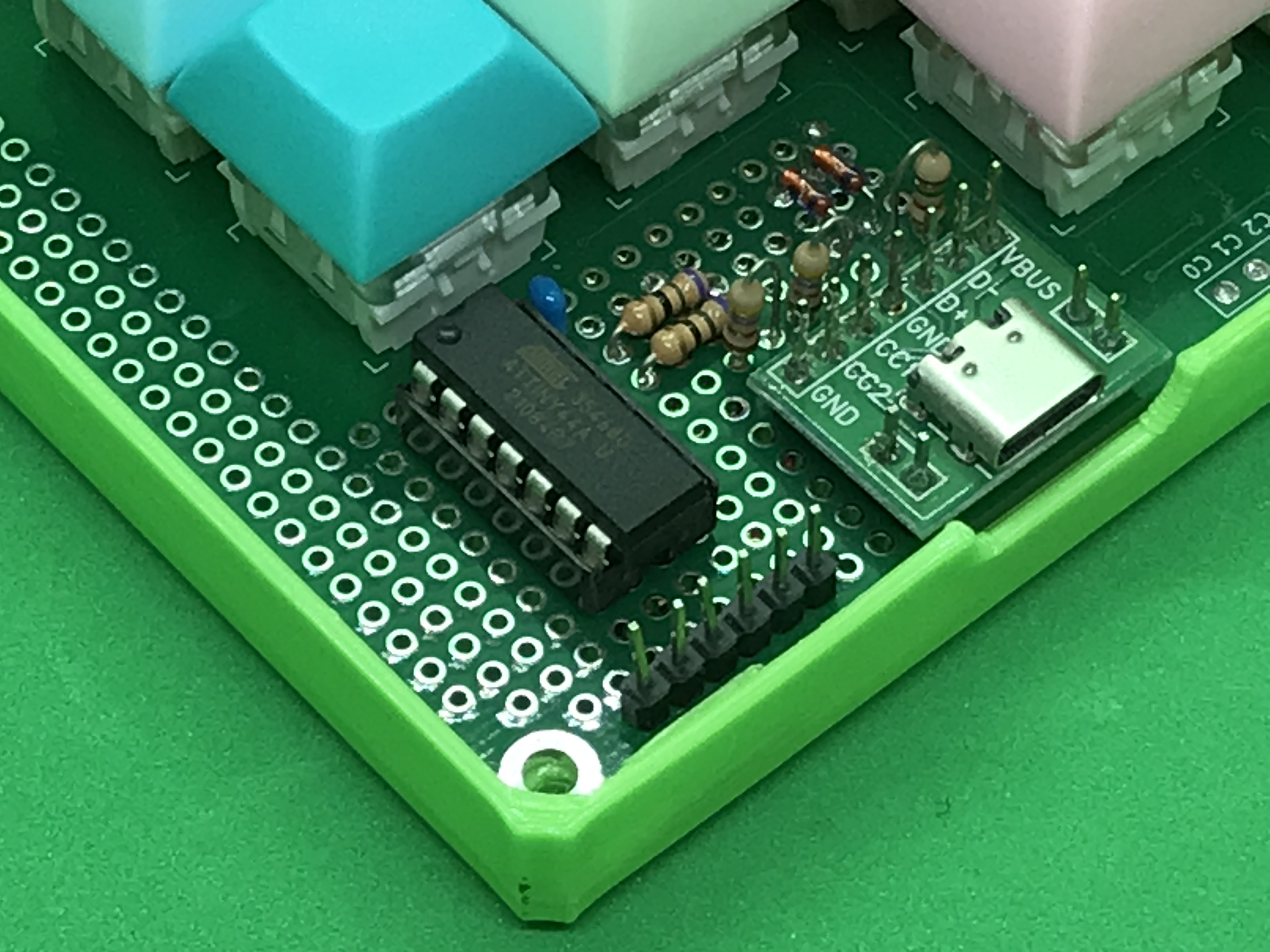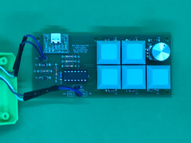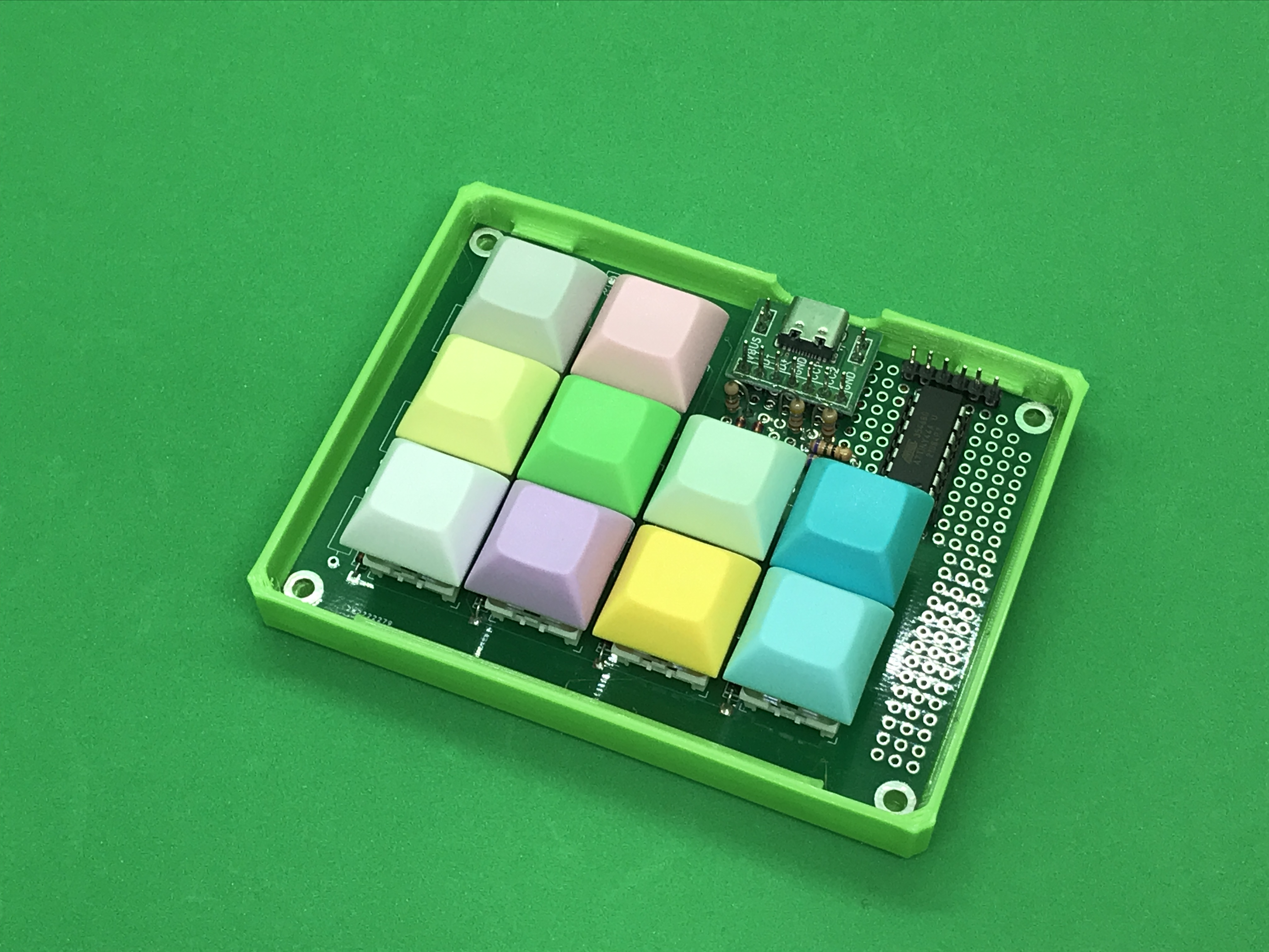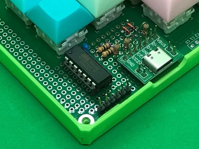 7月の基板を利用して、Type-Cなマクロパッドを製作しました。V-USBなファームウェアを書き込んだATtiny44Aをコアとすることで、部品コストを下げつつType-Cコネクタを実装したものとなります。