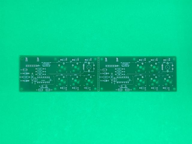 PCB発注のガーバーファイルとしては、1枚に2つ分の基板を押込み、切れ目として穴を並べたものを提出しました。リジェクトされずに製造されたので、これは面付け扱いにされないらしい。