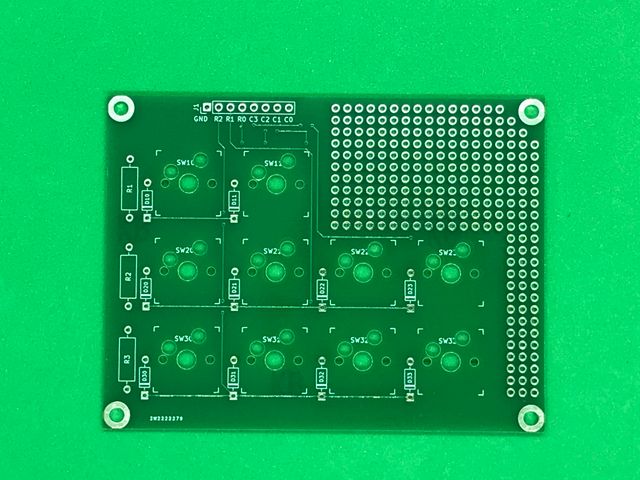基板上の回路としては、ソケット式の10キーと、ダイオードと、キーマトリクスの配線が引き出されているピンヘッダと、残りの空間はユニバーサル基板状態です。
