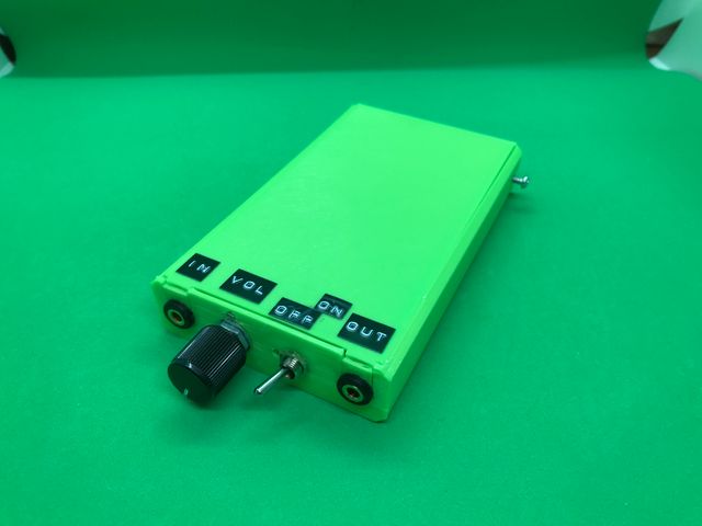 ユニバーサル基板で試作したときは増幅率5倍でしたが音量調整の範囲が足りないと感じたため、増幅率10倍で組み立てています。