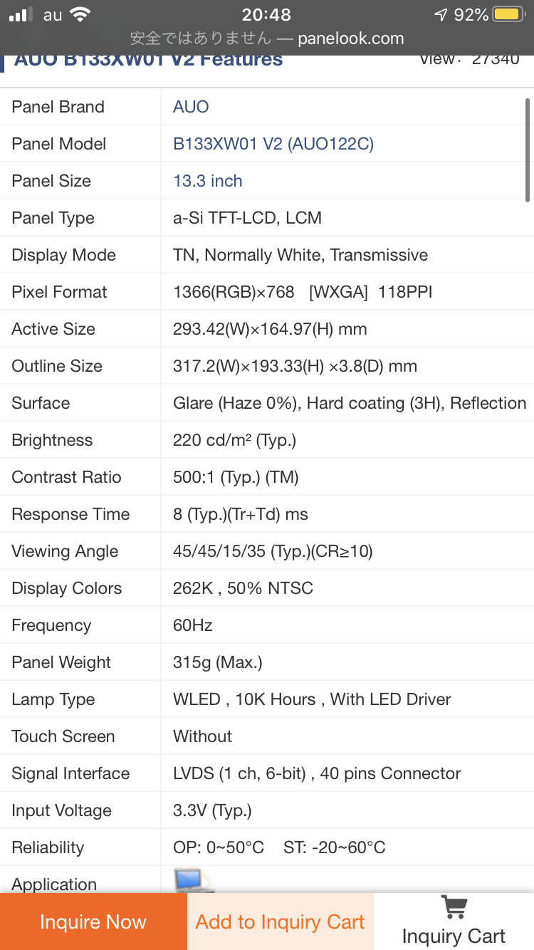 液晶の裏側に型番が記載されているので、以下のサイトから情報を得ます。[](url http://www.panelook.com/index.php)