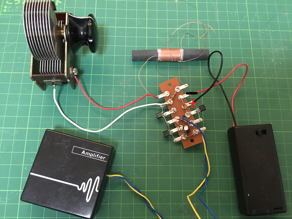 マイクロインダクタだと3V給電でちょうどよい感度ですが、バーアンテナでは1.5Vでも良好な感度で聞こえます。また、3V給電をすると若干発振気味ではありますがアンプ内蔵スピーカーを直接繋いで聞けるぐらいの音量が得られます。
