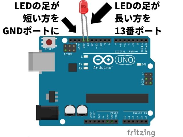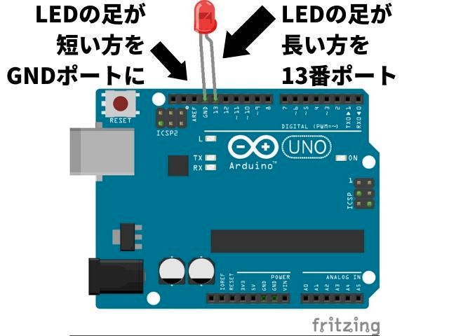 足が長い方がプラス側のアノードです。13番ポートには足の長い方を接続、LEDの足が短い方はGNDと書かれたポートに接続してください。