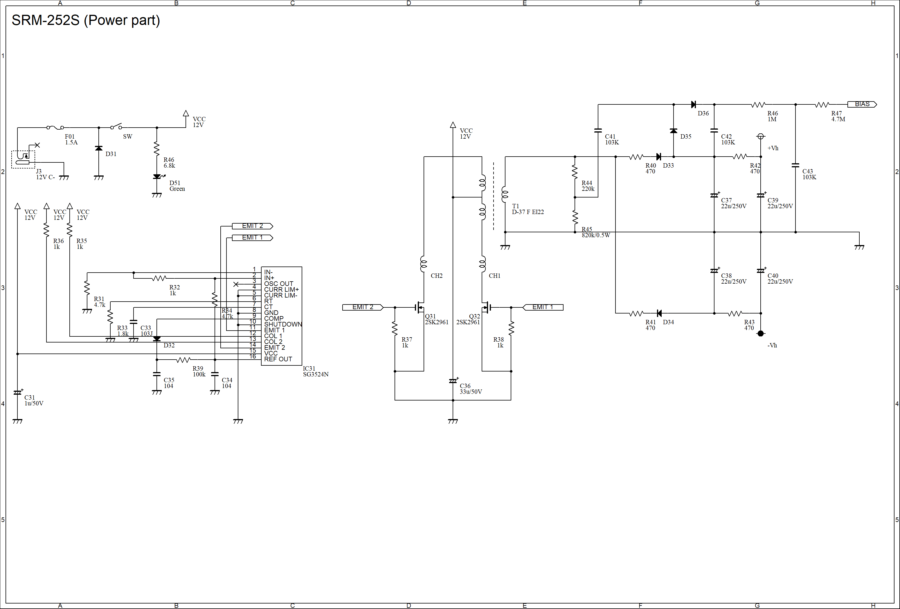 DCDCコンバーターでは、出力電圧をフィードバックして電圧を安定化するのが常識で、SG3524 にもそのための基準電圧源や入力端子がついています。しかし驚くべきことに、SRM-252S は電圧フィードバックを全くしていません。おそらく、負荷となるアンプ回路の消費電流が常に一定なので、安定化の必要がないという判断なのかもしれません。