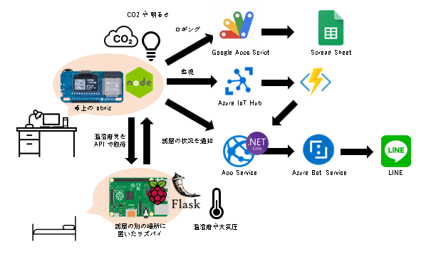 部屋の色んな情報を取得するシステムを作りました。リモートワークが中心であり、ずっと家にいあるので自分の部屋の環境改善をしたくなりました。IoT というほどではないかもしれないですが、ラズパイでのセンサを使った開発とかを経験してみたくなったので手を出したのですが、色々とやりたいことが増えた結果、色々なものが絡み合うシステムになってました。
