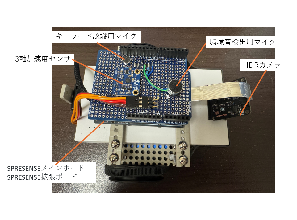 センサーとして、Spresense用のHDRカメラボード、コンデンサマイク、三軸の加速度センサーを使用してます。