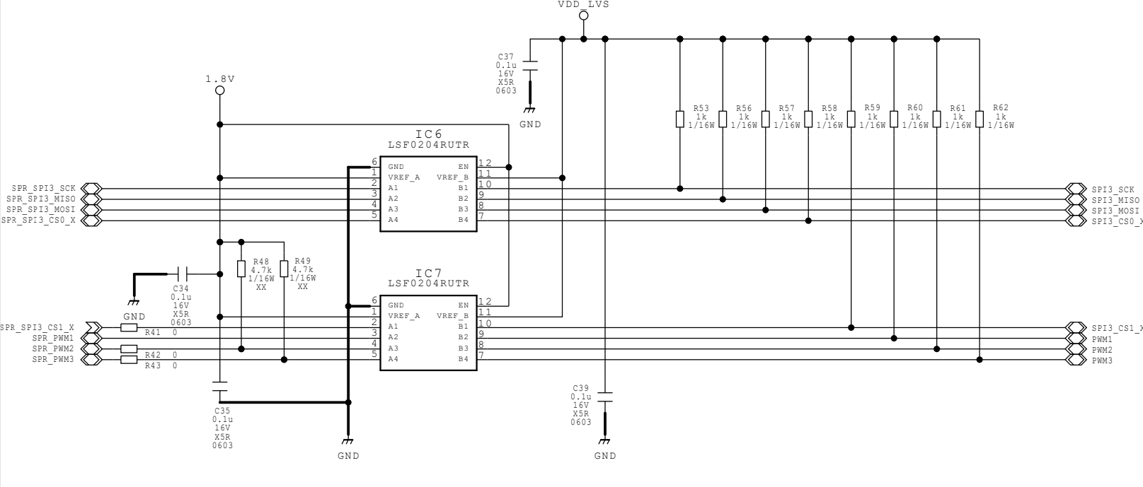 さて、ここで、Spresenseの拡張ボードの回路図を見てみます。外部に出てるI/O端子のあたりを抜粋すると以下のようになっています。
