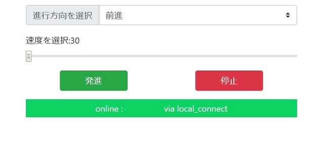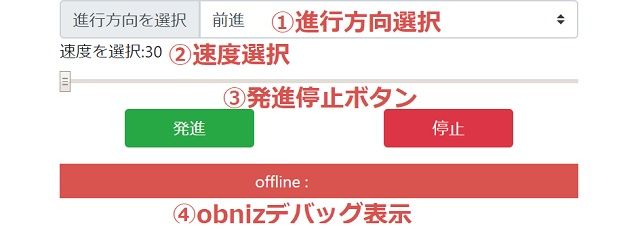 最初の「motor_direction.disabled=true;」ですが、発進ボタンを押して四輪駆動車が動作しているときは進行方向の切り替えを無効にしています。