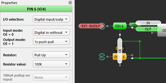 具体的には、端子設定を双方向1xpush pull 、100kΩプルアップにし、INにVDDをつなぐと、OE端子に入力した信号が反転してOUT端子から出力されます。この接続では外部端子はHigh出力固定のままになります。