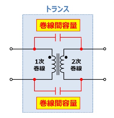 磁気シールドが無い場合ボビン内の1次-2次間のコイルが隣接してると、1次2次間の容量結合でコモンモードノイズの侵入を許してしまう