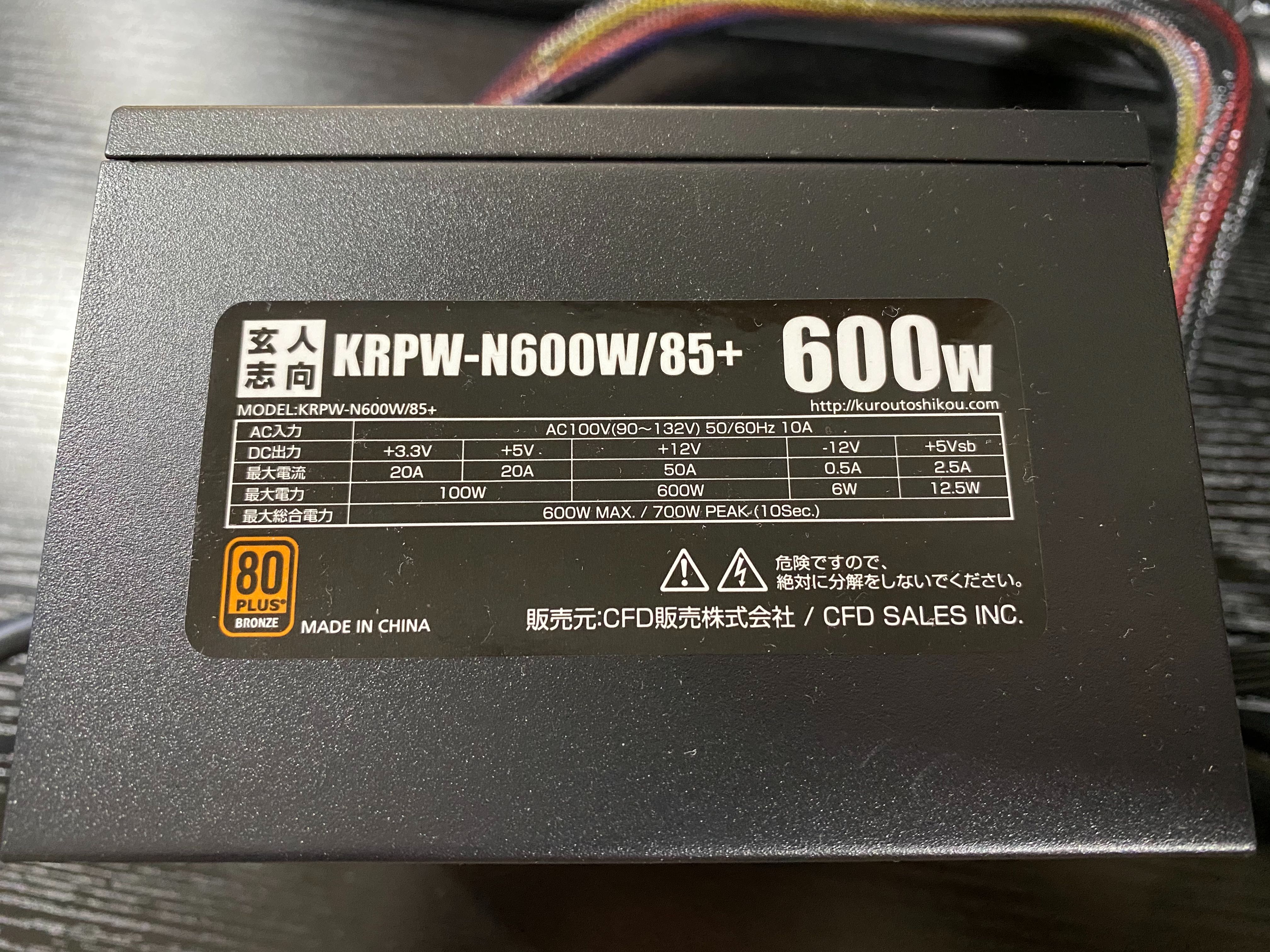 部屋を掃除していたら、玄人志向のKRPW-N600W/85+という6000円程度の電源を発見しました。