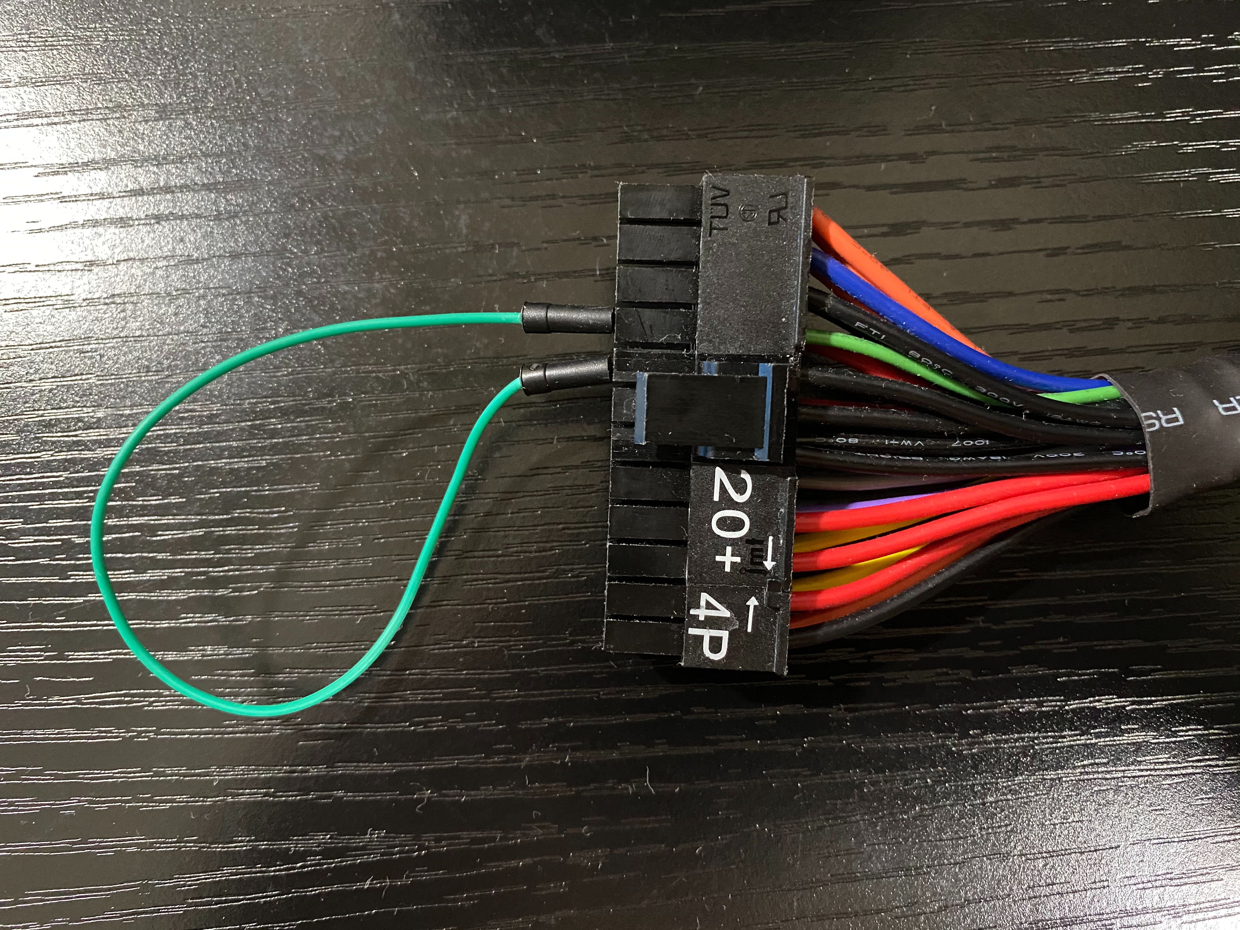 24ピンコネクタの16番ピン(Power on 緑色)をGroundに接続すると、ATX電源のファンが回りだして各ピンに電圧が発生します。