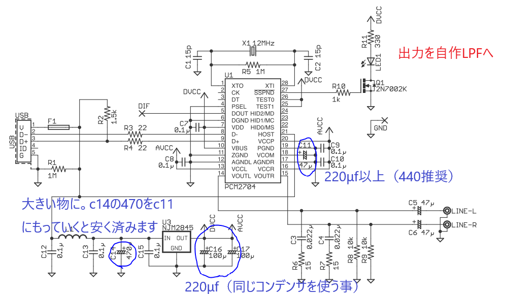フィルタを付けるまえにコンデンサの換装を行います。変更点はC14のコンデンサを標準装備の物より大きなものに。C11を220μf以上のもの。c17、16は220μfに交換します。