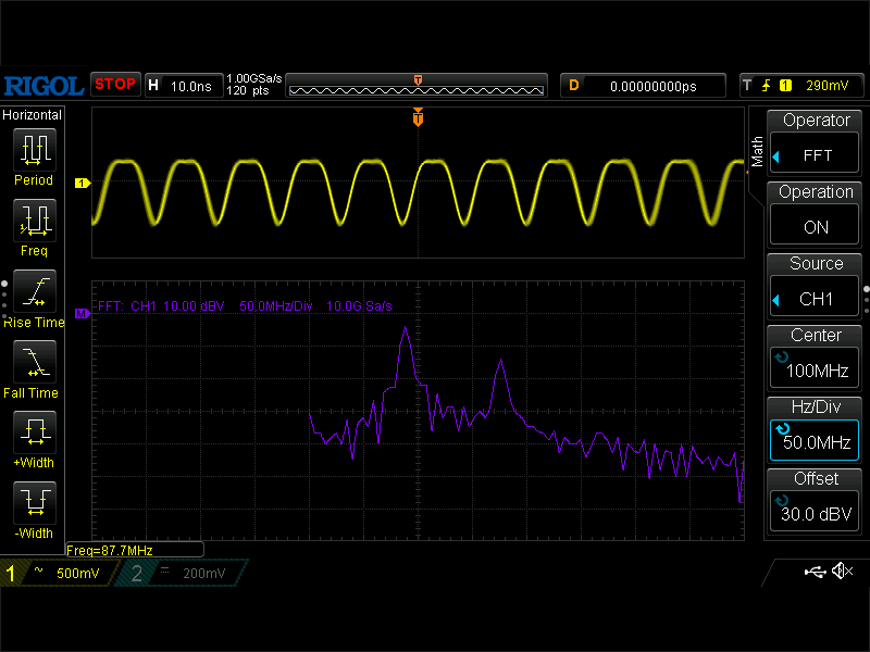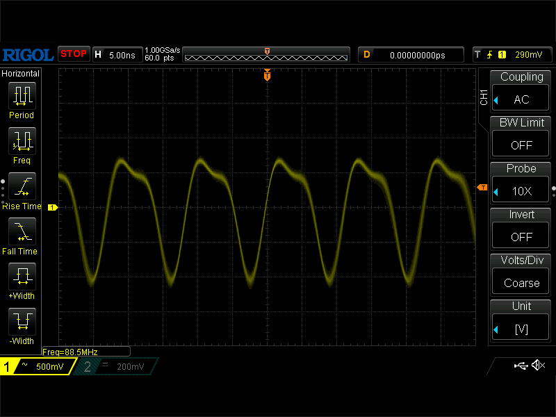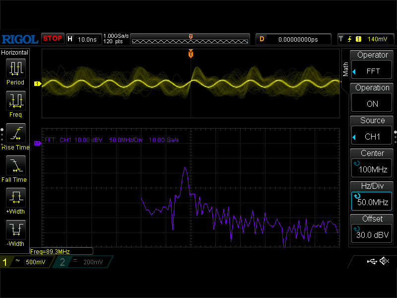 FFT モードで見ると基本波がしっかり出ていて、悪さしているようなものはなさそうな感じですけど。こんどは周波数が 89.3MHz になっているんで、オシロスコープの誤差なんでしょうかね。