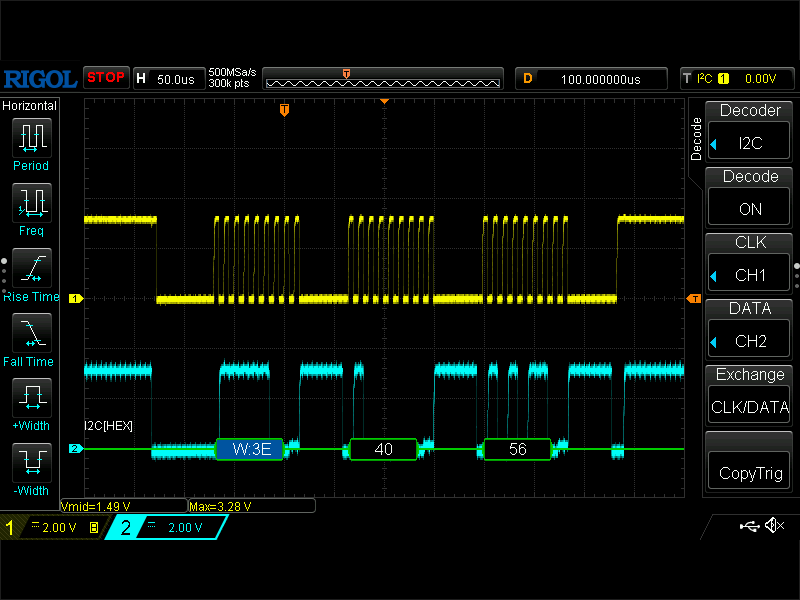 青色はデータ SDA で、アドレス 0x3E (Write モード) に続いて 2byte のデータが送られています。データ内容は調べていませんが、この通信は常に行われていました。