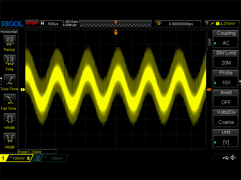 ノイズが載ってますが、まぁ世の中ノイズだらけでこんなものです。なお、オシロスコープで 20MHz の帯域幅制限を設定しています。