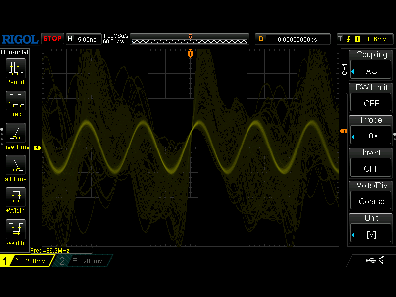 複雑な波形がゴーストのようにでていますが、ディスプレイによって見えたり見えなかったりします。周波数が 86.9MHz と表示されているのは波形が複雑だから?それともプローブの容量のせいで周波数が下がってる?