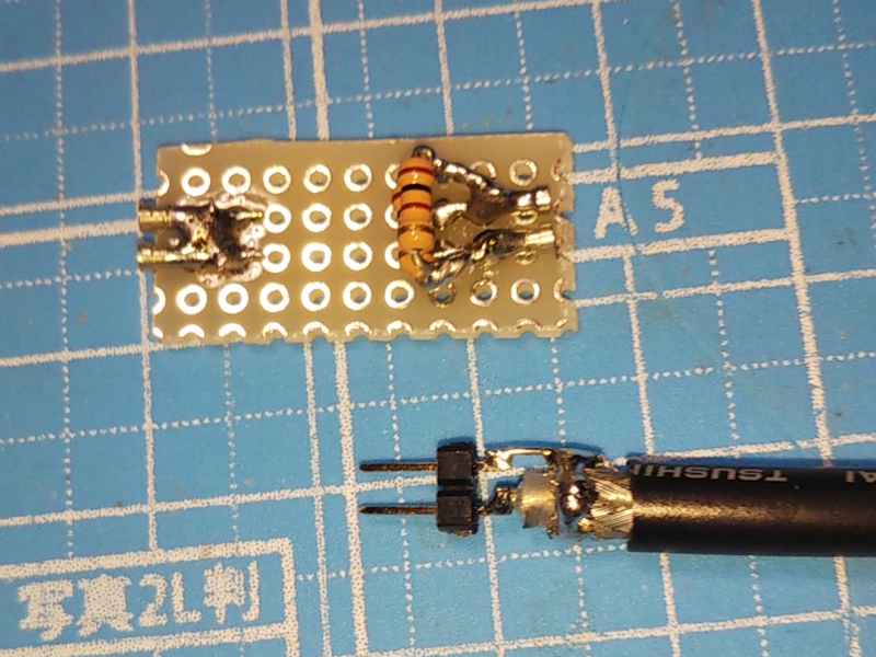 プリント基板上での測定のために、簡単なプローブを作ってみました。同軸ケーブル RG58A/U の先端にヘッダピンをハンダ付けしただけです。