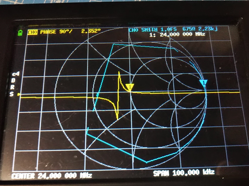 トランスミッタ IC QN8027 につながれた水晶発振子 24.000MHz の両端に NanoVNA のプローブをあてると、こんな感じ。DISPLAY/FORMAT/PHASE と DISPLAY/FORMAT/SMITH でトレースしています。