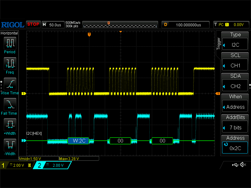 黄色の波形はクロック SCK です。スタートコンディションで始まり、3byte 分出力してストップコンディションになっています。クロック周期が 10μs なので、伝送速度は標準モードの 100KHz だとわかります。