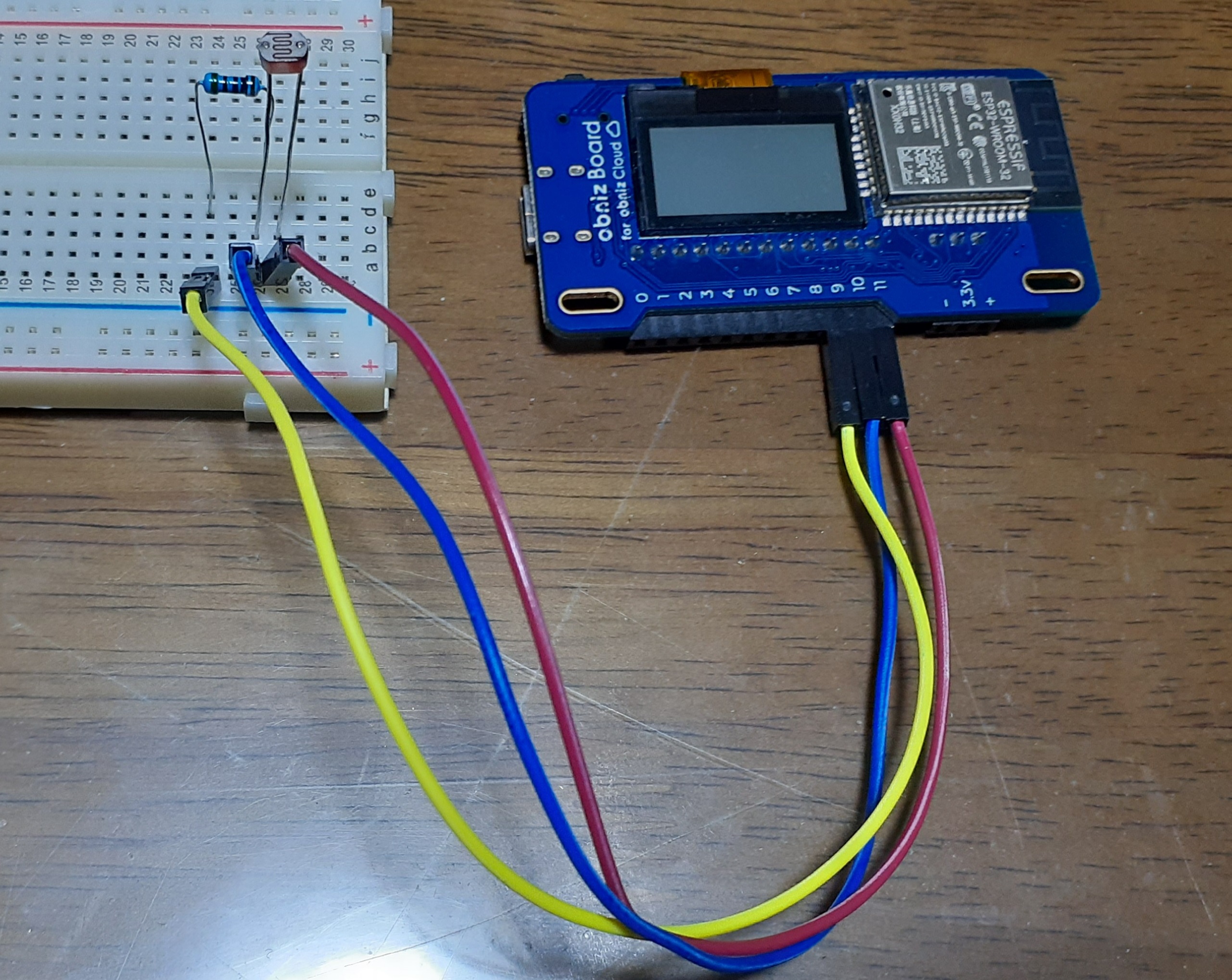下の写真のように配線したものをお好きな箱の中に入れます。(obnizへの電源必須)